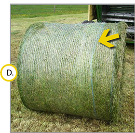 | Matas grödan fortfarande genom balpressen allt eftersom nätet appliceras så att allt nät är på utsidan? Korrekt nätapplicering är helt och hållet på UTSIDAN av balen. Det är viktigt att när nätet väl appliceras ska framåtgående rörelse för balpressen stoppas för att undvika att gröda tas in när nätet appliceras. Om det händer blir det inte möjligt att fullt nyttja nätets ”hopfogningsegenskaper” eftersom delar av nätet nu är finns på balens insida och på så sätt minskar nätets förmåga att hålla samman balen. |
